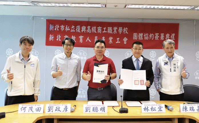 新北市教育人員產業工會(17)日與復興商工舉行首份團體協約簽署儀式,在勞工局長陳瑞嘉、教育局專委何茂田、勞動部關係司專委劉政彥共同見證下,由復興商工副校長劉聰明、新北教產理事長林松宏代表簽署,重要內容包括教師學術研究加給、基本授課節數比照公立學校標準,以及提高導師職務加給等。這份經過2年馬拉松式協商產生的團協,不僅展現了勞資雙方堅守誠信協商的決心,更讓私校教職員勞動權益跨出一大步,值得掌聲鼓勵。