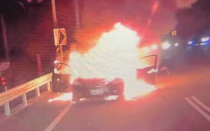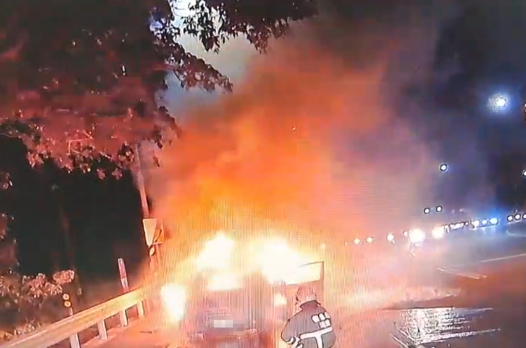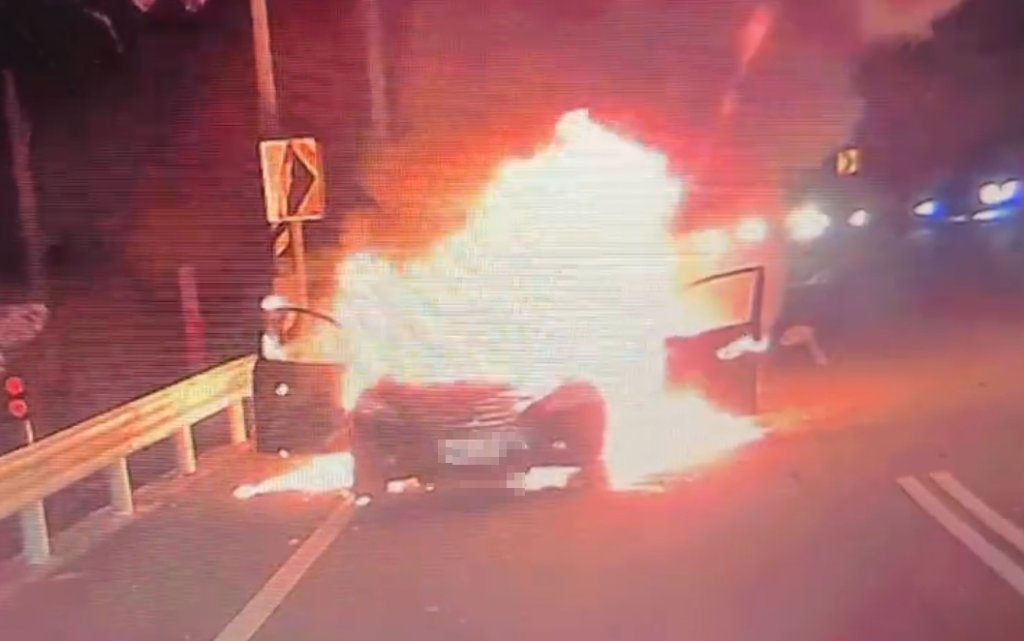10月18日17時58分,苗栗縣消防局獲報三灣鄉三灣村三灣14-1號旁邊自小客車起火,出動三灣分隊2車5人,由小隊長廖祥帆帶隊前往灌救。