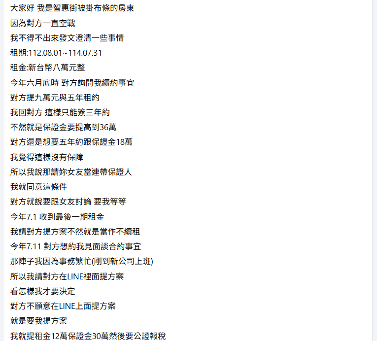 事發多日後,房東在爆料公社二社出面回應,稱租金新台幣八萬元,今年六月底時對方詢問續約事宜,提九萬元與五年租約,房東說這樣只能簽三年約不然就是保證金要提高到36萬,「對方還是想要五年約跟保證金18萬,我覺得這樣沒有保障」,對方不願意在LINE上面提方案,「我就提租金12萬保證金30萬然後要公證報稅」,快到月底時對方完全沒有搬遷的跡象,七月底寄存證信函,「