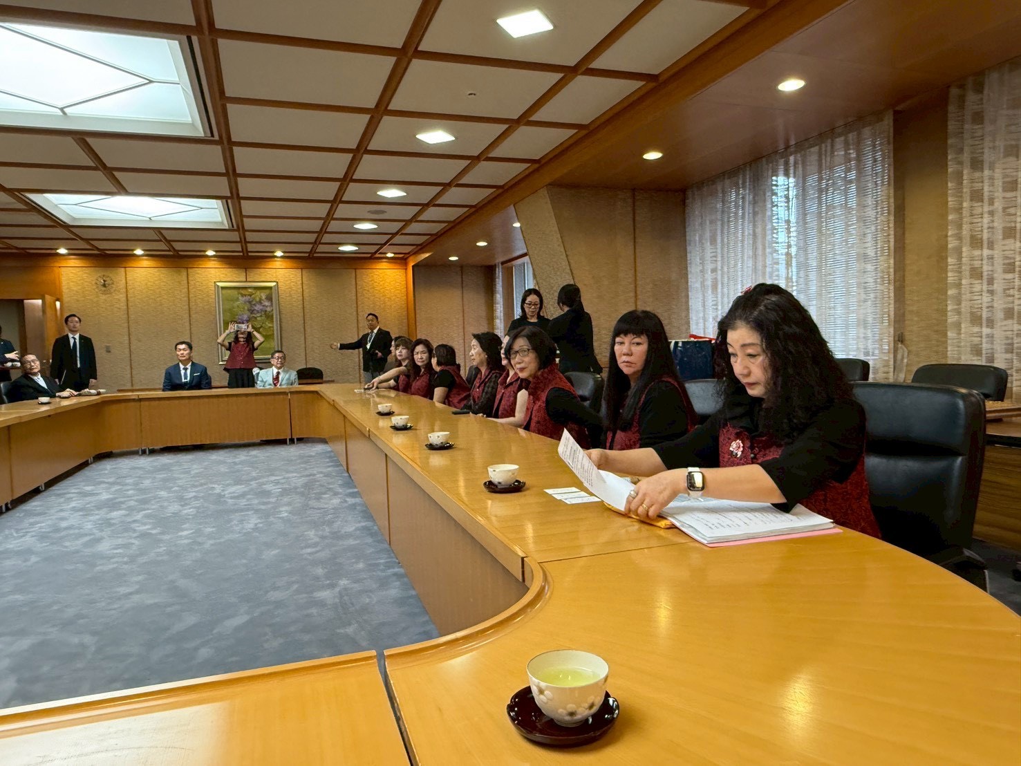 代表團在當天上午拜會京都府知事西脇隆俊,雙方針對文化藝術、經濟發展及女性權益議題熱烈交流。畫家劉白雪更親手致贈花卉主題畫作,象徵台日友誼長存,現場氣氛溫馨感人。