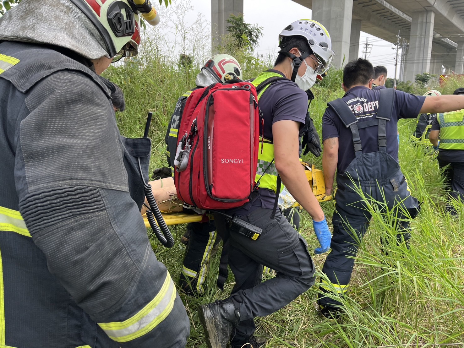 一名女子騎機車從國道4號高架橋墜落,消防隊員前往救援。翻攝畫面