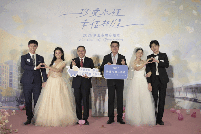 2025新北市聯合婚禮(19)日於新北市政府浪漫登場,102對新人在市長侯友宜、副市長劉和然的見證下,互許終身、交換誓言,齊聲喊出「我願意!」,現場洋溢著滿滿幸福與祝福,溫馨氣氛瀰漫整個會場。