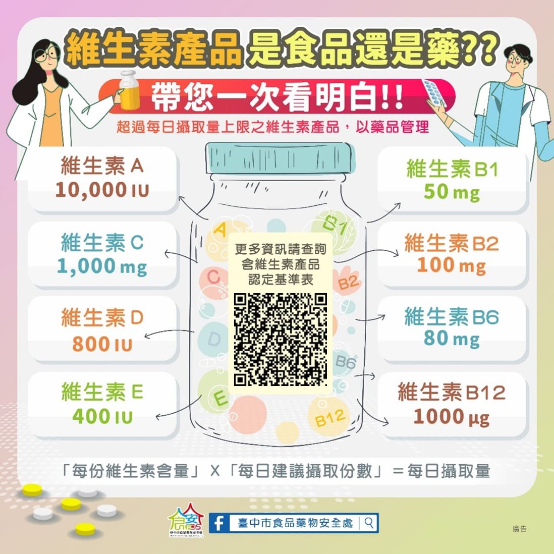 食安處呼籲,民眾選購營養補充品時,應詳閱產品標示及每日服用劑量,避免誤將藥品當作保健食品,或違法從事網路販售行為。市府將持續加強稽查與宣導,維護民眾用藥安全與食品衛生。如需查詢維生素相關法規資訊,可至衛生福利部食品藥物管理署網站查詢。