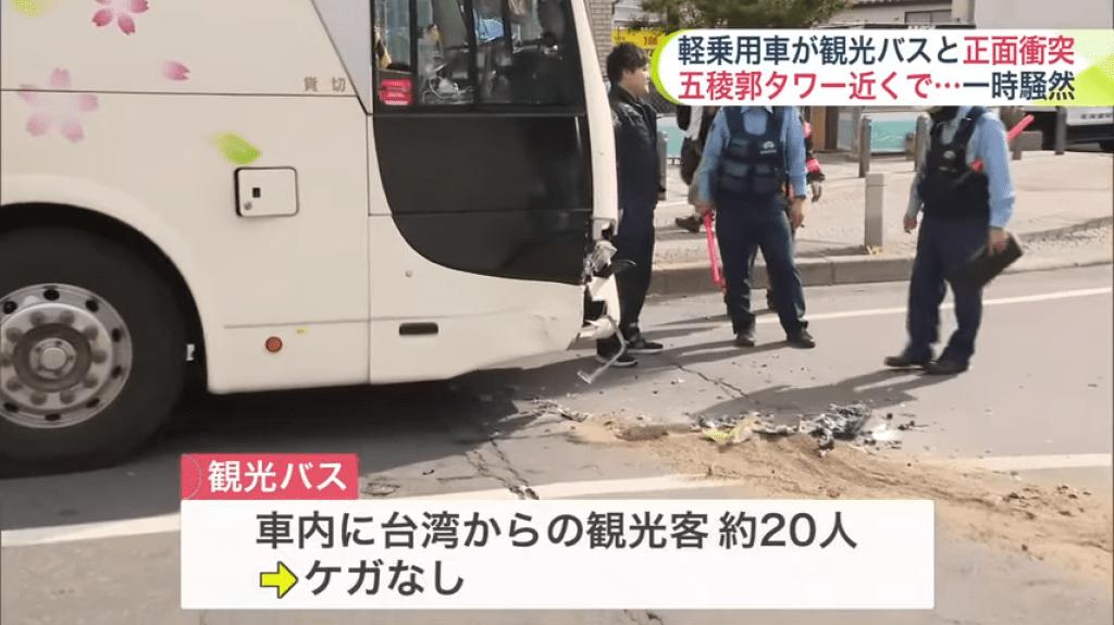 巴士上載有約20名來自台灣的觀光客,所幸全員並無受傷。輕型乘用車的男性駕駛也沒有受傷。