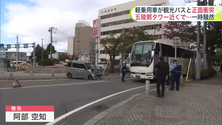 根據UHB北海道文化放送報導,事故發生在20日上午11點左右,地點位於函館市五稜郭町、市道與道道交會的十字路口。當時,一輛沿市道直行的K-Car突然駛入對向車道,與停著的觀光巴士正面相撞。