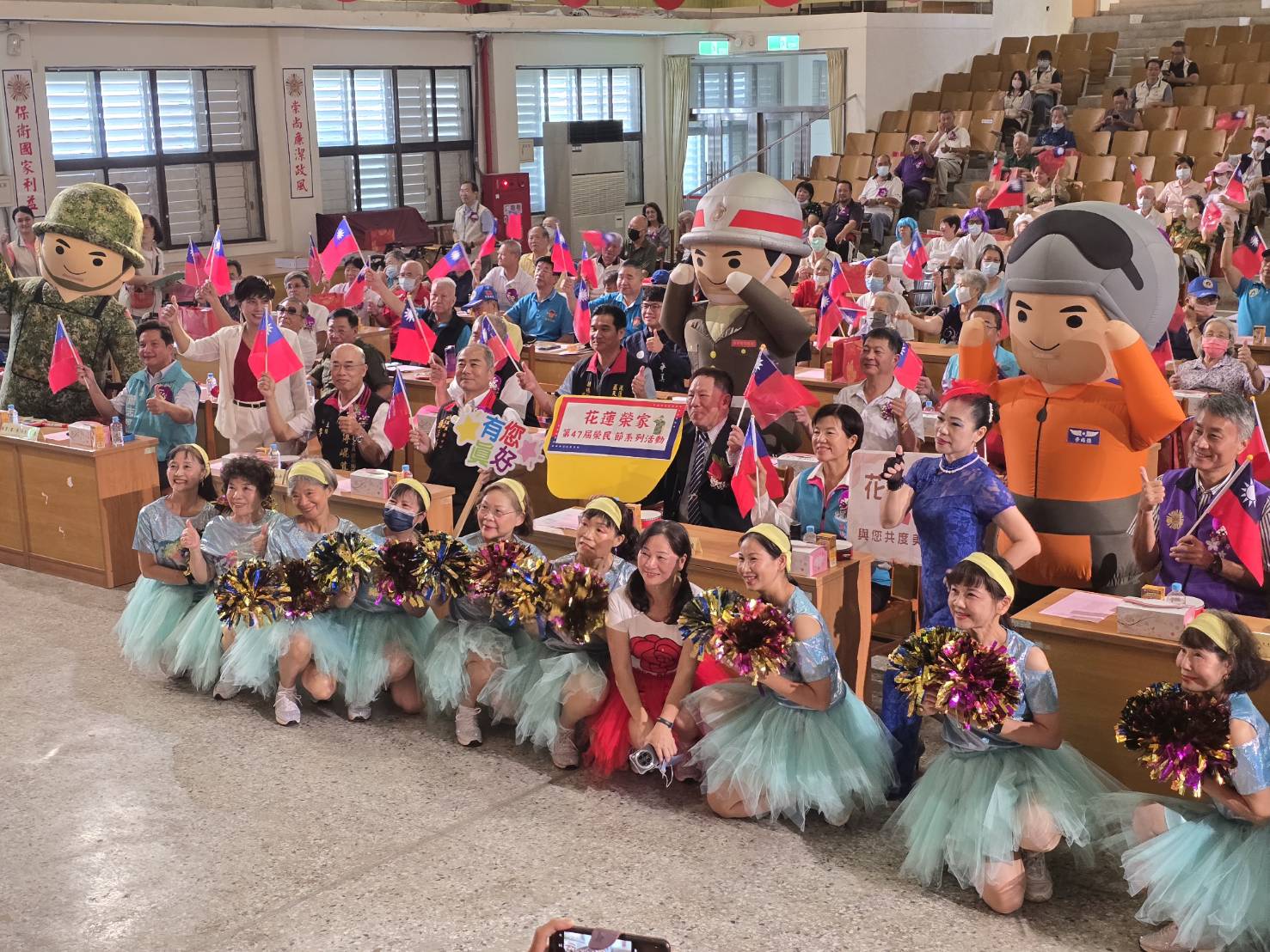 慶祝大會由三軍大型充氣人偶熱鬧開場,隨後,表揚40位優秀榮民、住民、員工及公益楷模,感謝他們長期以來的卓越表現與無私奉獻。其中,公益楷模受獎者包括提供法律協助的律師萬鴻均、贈送住民餐券的花蓮麥當勞董事長楊政道,以及捐贈洗澡沐浴床5床的世界華人工商婦女企管協會花蓮分會理事長吳素琴,他們多年關懷長者,展現社會無私的溫暖與力量。