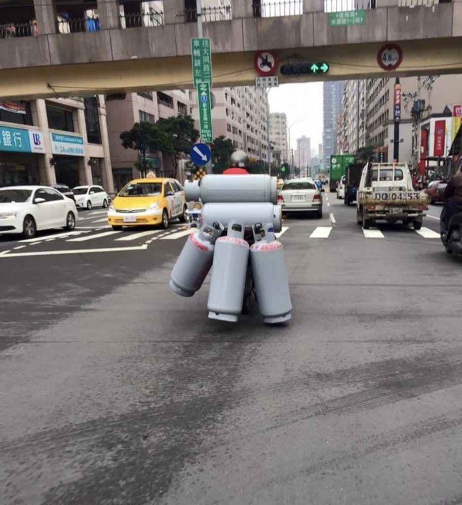 【Lai傳媒、記者爆料網/謝建成/新北報導】新北街頭出現一幕超吸睛的畫面!一名瓦斯行騎士載著滿滿的瓦斯鋼瓶,在車陣中穿梭,遠看就像「鋼鐵人」背著火箭包準備起飛。照片被路人拍下PO網後,立刻引起熱議,網友紛紛留言:「這畫面太壯觀」、「根本瓦斯戰士出任務」、「看了都替他捏一把冷汗」。