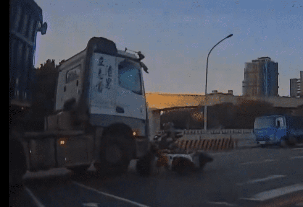 新北市鶯歌區機車騎士連人帶車摔倒險遭大車輾過。翻攝畫面