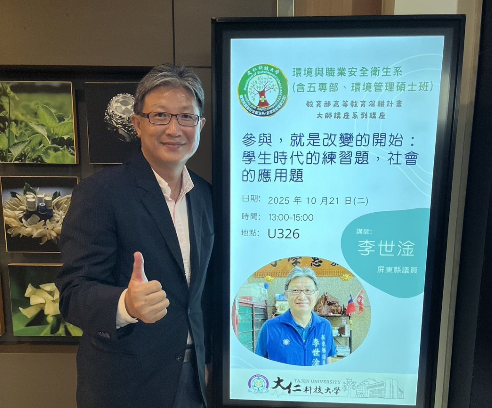【記者戴英薇/鹽埔報導】 為深化學生對社會實務與公民參與的認知,大仁科技大學環境與職業安全衛生系(前公害防治科)特邀第20屆屏東縣議員、84年畢業校友李世淦學長返校進行專題演講。本次演講由賴文亮教授提供核心主題:「參與,就是改變的開始;學生時代的練習題,社會的應用題」。李議員以其傳奇的奮鬥史,為學弟妹揭示知識與行動結合所能爆發的巨大力量。