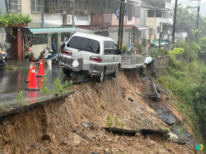 三峽道路邊坡崩塌廂型車車輪懸空。翻攝畫面