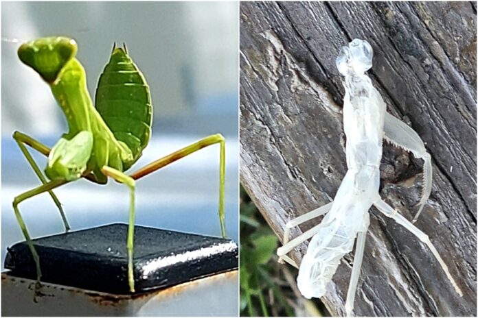 長年悠遊山林鄉野,探索自然生態,幾乎無所不觀,無所不察,卻難得看到螳螂蛻皮!查看資料才知道,此等蟲蟲世界的狠角色,孵化後從若蟲至成蟲,生命周期大約一年,脫皮次數約有8至12次,再一次次的成長,萬一脱皮失敗,大概就沒命了。