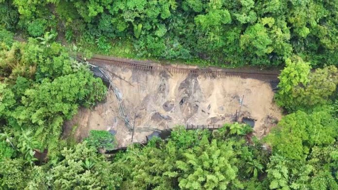 受到連日大雨的影響,新北市台鐵平溪線嶺腳車站以北約500公尺,附近鐵軌路基被淘空百公尺,透過民眾空拍,直擊現場鐵軌路基被淘空的畫面,且今天三貂嶺到大華間邊坡有再滑動的情形,目前平溪線全線停駛。
