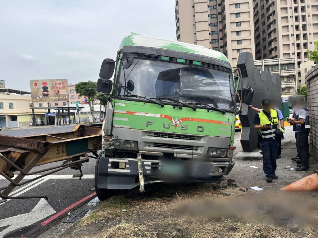 驚險一撞!半聯結車擦撞分隔島 小港警火速排除恢復暢通.(圖/翻攝)