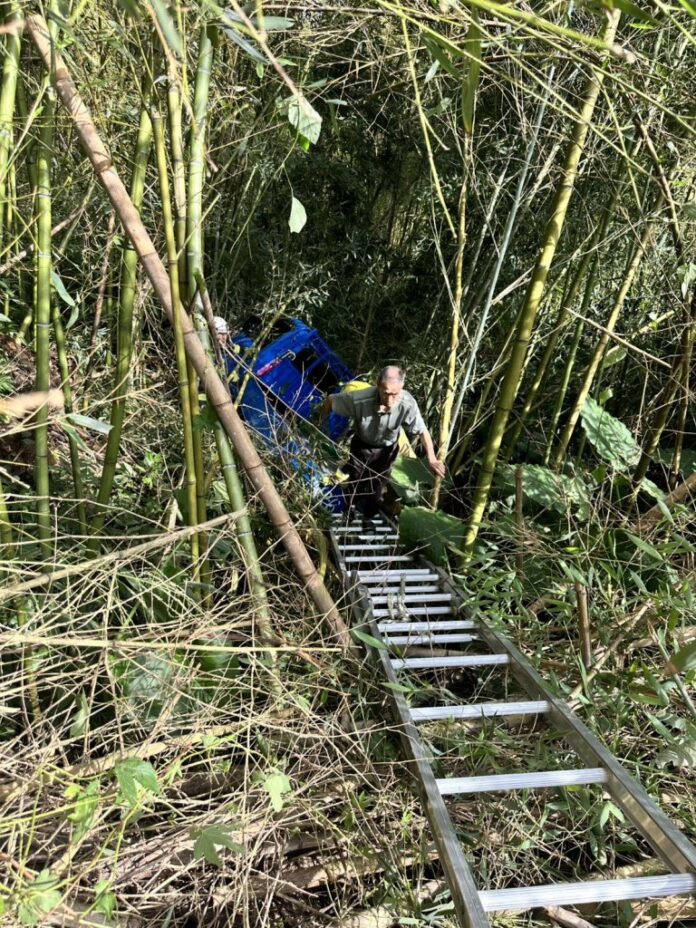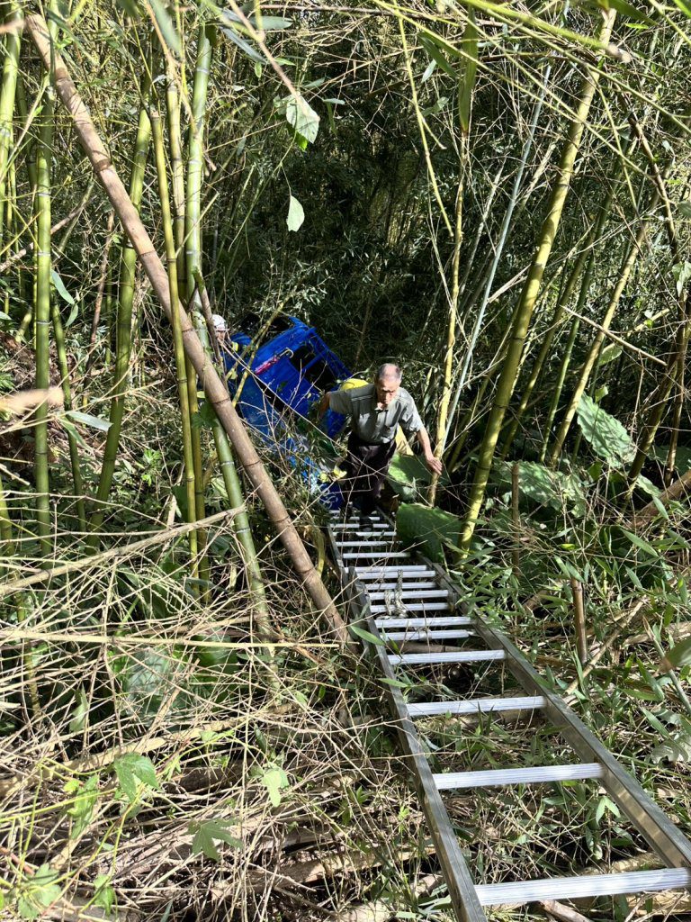 7旬夫妻共乘的小貨車衝落山谷,消防隊員架梯救援。翻攝畫面
