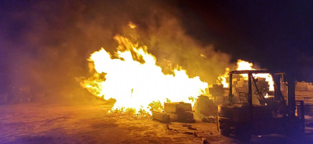 消防隊員到場,確認係湖西鄉鼎灣村某營造公司放置建材場所內堆置之木棧板起火燃燒。經部署水線出水搶救,火勢於21時09分控制。22時37分營造公司調度挖掘機1輛,前往配合水線處理悶燒之木棧板。23時33分火勢完全熄滅,燃燒木棧板面積約150平方公尺,另有1輛堆高機遭火勢波及半毀。有關本起火警詳細起火原因及財物損失,刻由消防局火災調查科調查中。
