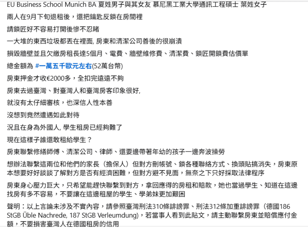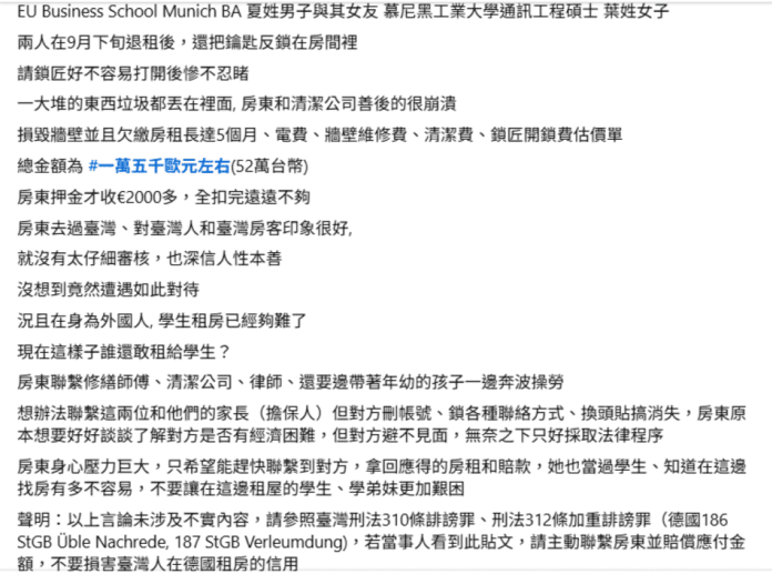 網友在臉書「慕尼黑臺灣同學會」發文指出,EU Business School Munich BA 夏姓男子與其女友 慕尼黑工業大學通訊工程碩士葉姓女子,兩人在9月下旬退租後,還把鑰匙反鎖在房間裡,請鎖匠好不容易打開後慘不忍睹,一大堆的東西垃圾都丟在裡面,房東和清潔公司善後的很崩潰,損毀牆壁並且欠繳房租長達5個月、電費、牆壁維修費、清潔費、鎖匠開鎖費估價單,總金額為一萬五千歐元左右(52萬台幣),房東押金才收€2000多,全扣完遠遠不夠。