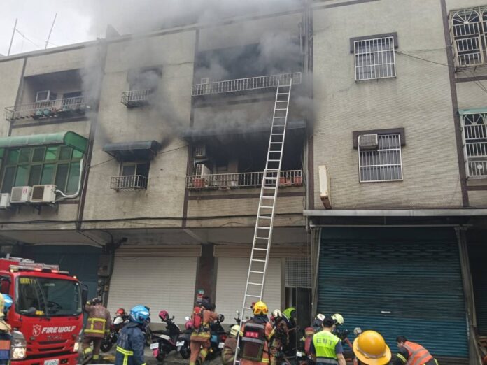 新莊4樓民火警濃煙竄出,消防隊員架梯救援。翻攝畫面