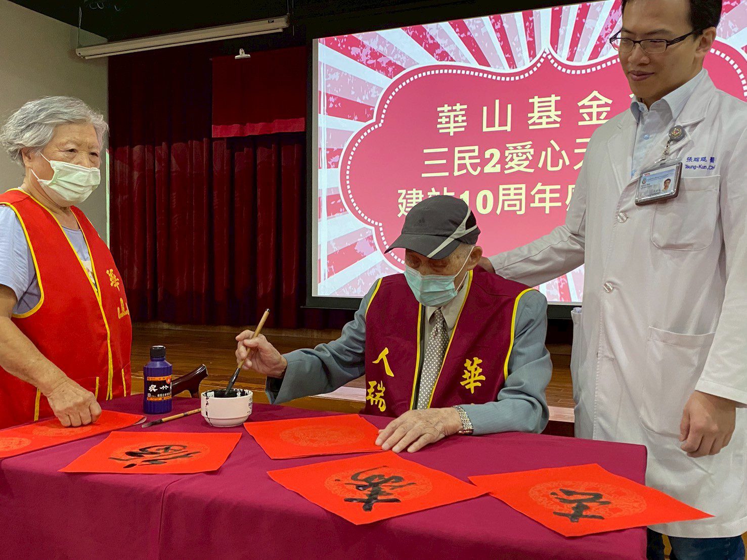 現場揮毫寫春聯傳遞祝福,參與揮毫的百歲人瑞蔡爺爺,高齡九十歲呂爺爺,不僅展現長輩精神風采,更期許在長者服務的路上,華山基金會與高雄醫學大學附設中和紀念醫院可以持續前行、百年不墜。