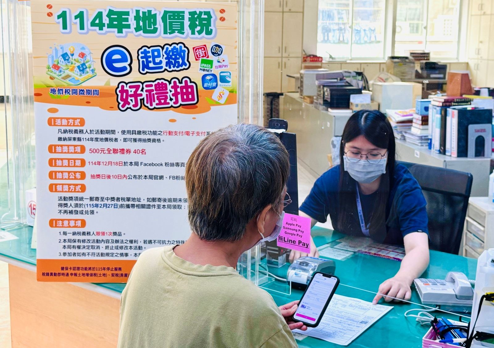 自114年11月1日至11月30日止,納稅義務人只要使用具繳稅功能的行動支付或電子支付工具,包含至財稅局及三分局臨櫃行動支付,繳納114年開徵的屏東縣轄內地價稅,即可自動取得抽獎資格,無需額外登錄。
