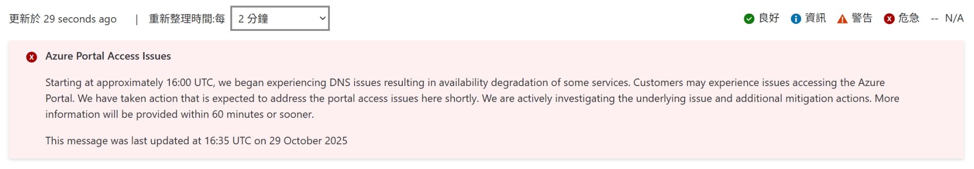 根據 Microsoft 官方 Azure 狀態頁面(Azure Status Page) 最新公告,問題起始於世界標準時間(UTC)16:00 左右,起因是 DNS(網域名稱系統)異常,導致部分服務無法正常連線。官方表示:「我們已採取行動,預計很快能恢復入口網站存取,目前仍在積極調查根本原因與後續緩解措施。」這則公告在 10 月 29 日 16:35(UTC)最後更新,也意味著 Microsoft 工程團隊仍在處理當中。