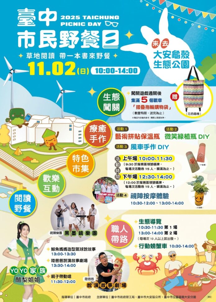 台中市政府勞工局攜手大安區公所,於11月2日(星期日)上午10點在大安龜殼生態公園舉辦「台中市民野餐日」活動(大安場),今年度「台中綠美圖」預定於12月13日正式開幕,此次活動以「草地閱讀」為主題,號召市民朋友帶上親愛的家人,並帶著喜愛的一本書,作伙來草地閱讀,輕鬆度過假日時光。