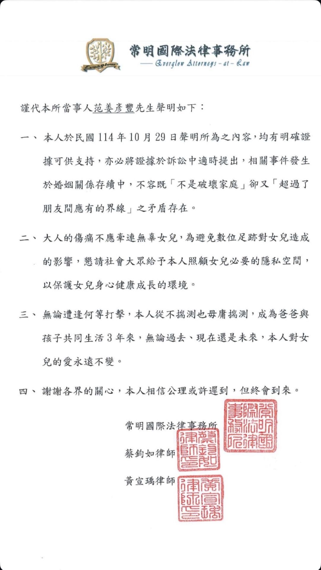范姜彥豐在聲明中指出,29日對外揭露的內容均有具體事證支持,未來將在訴訟過程中適時提出。他強調,自己不是情緒性發言,而是「一切有據」,同時也希望外界不要以惡意揣測或過度延伸報導,並呼籲社會給予家人應有的隱私空間,避免數位足跡傷害無辜。