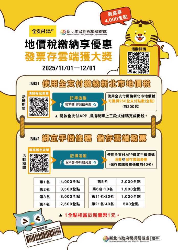 地價稅要開始繳納了唷!新北市政府稅捐稽徵處與全支付電子支付股份有限公司於114年11月1日至12月1日共同舉辦「地價稅繳納享優惠 發票存雲端獲大獎」活動,於活動期間填寫表單取得參加資格,並使用全支付繳納新北市地價稅或綁定手機條碼消費儲存雲端發票,就有機會獲得全支付點數(全點)!