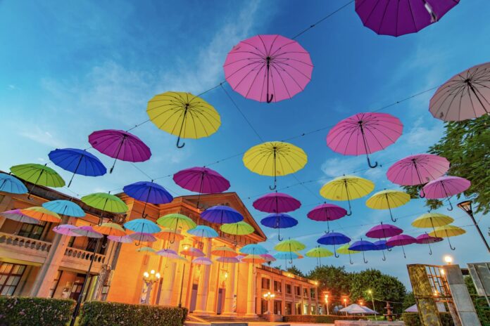 ▲「板橋435藝文特區」環繞綠地與噴泉,搭配繽紛傘景與藝術展,是全家共享探索樂趣的絕佳去處。(圖/新北市觀旅局 提供)