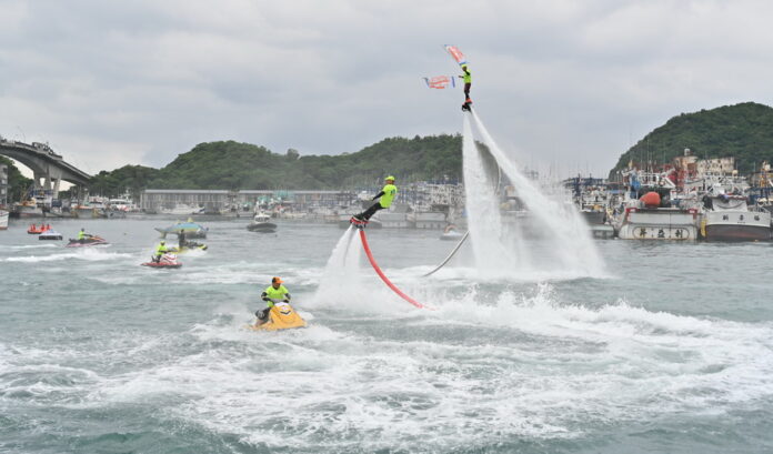 第二、「鯖」光啟動:水上鋼鐵人×海巡艦鳴笛點亮開幕儀式,由兩位「海上鋼鐵人」飛人手持大漁旗升空揭幕,與代理縣長林茂盛等人共同啟動「鯖海LED光影儀式」,象徵「從鯖開始」的永續行動正式展開。