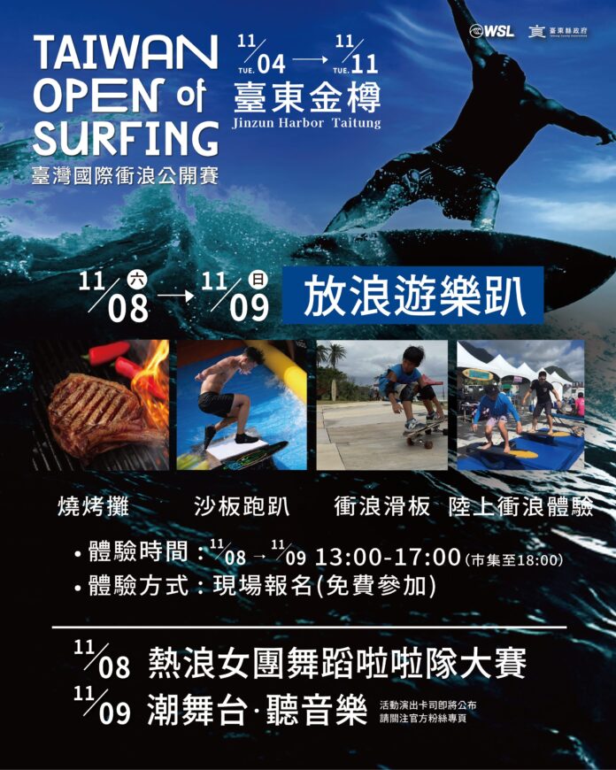 「2025臺灣國際衝浪公開賽」,11月4日11日將在臺東金樽舉辦,賽事規模升級至QS6,000積分巡迴賽,逾200位12國的頂尖衝浪選手競逐最高榮耀,11月8日、9日連續兩天「放浪遊樂趴」更為今年注入最熱情氛圍,10支隊伍熱情應援的舞蹈啦啦隊大賽,還有潮舞台活動邀請藝人、樂團表演。