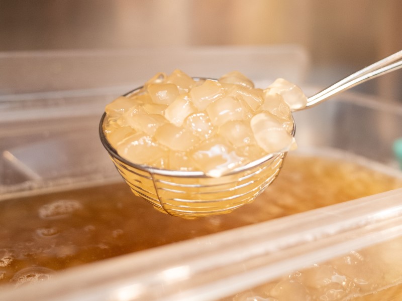 晶瑩剔透的粉角絕對是最佳優質配角,口感Q彈帶勁、軟中帶韌比起珍珠更加滑潤!而且粉角還會吸附茶的香氣,淡淡甜香帶上茶味越嚼越香,推薦給喜歡清爽系咀嚼感的朋友品嚐看看,一嚼就上癮!
