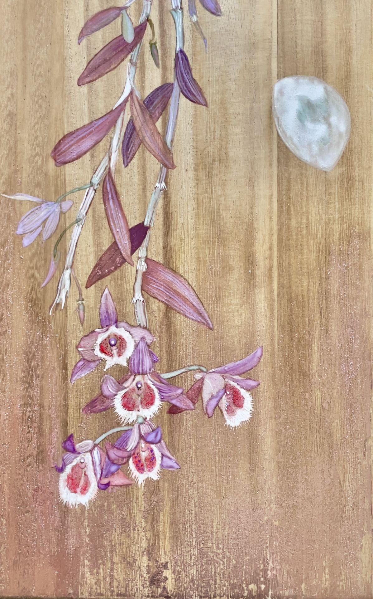 這次展出的作品主題很豐富——有荷花在水面盛開又凋零,有蘭花在木紋上靜靜垂掛。畫家們想說的是:世界一直在變,花開花謝、陰晴圓缺都是自然,但那些動人的瞬間,值得我們用最細膩的方式留下來。