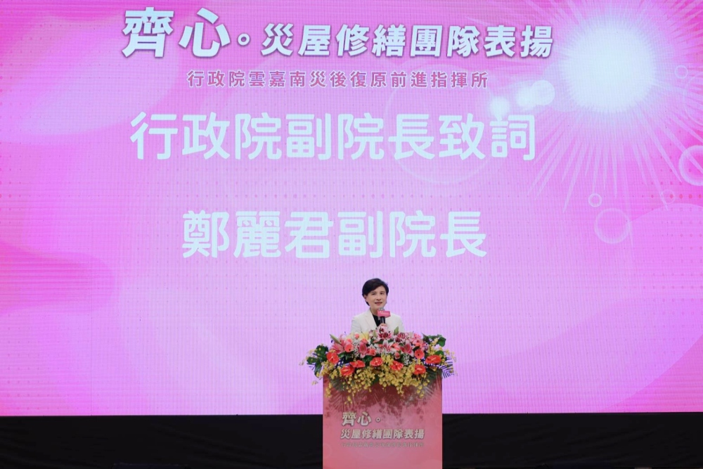 行政院「雲嘉南災後復原前進指揮所」, 6日舉辦「雲嘉南災後復原協助廠商表揚茶會」,行政院副院長鄭麗君、政委陳金德,向全體協助災後復原工作的地方政府、技術團隊與290家協助廠商,致上最誠摯的謝意與敬意。嘉義縣長翁章梁也親自出席表達感謝之意。