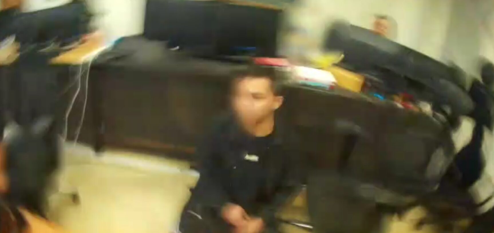 博弈機房成員被警方破門攻堅震懾嚇得坐在椅子上不敢動。翻攝畫面