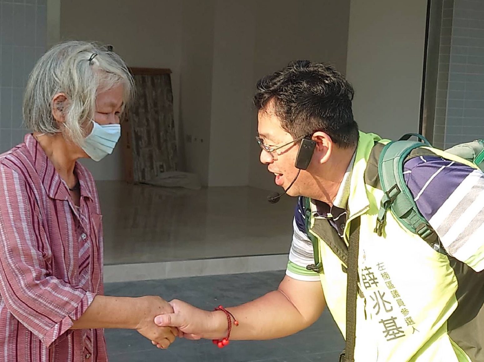 居民們對這樣的到訪方式顯得親切而自然。有人認出他笑著表示:「看過你的看板,本人比照片年輕很多啦!」也有居民聽到政見後直接回饋:「你提的樂齡長青局還有楠梓大學城,我覺得很實在,真的需要有人做。」