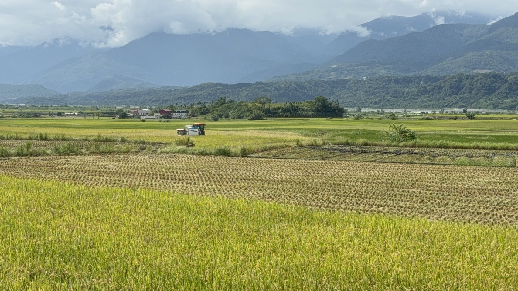 ▲花蓮二期水稻進入成熟期,農友搶收防範鳳凰颱風侵襲成災。(圖/縣政府提供)