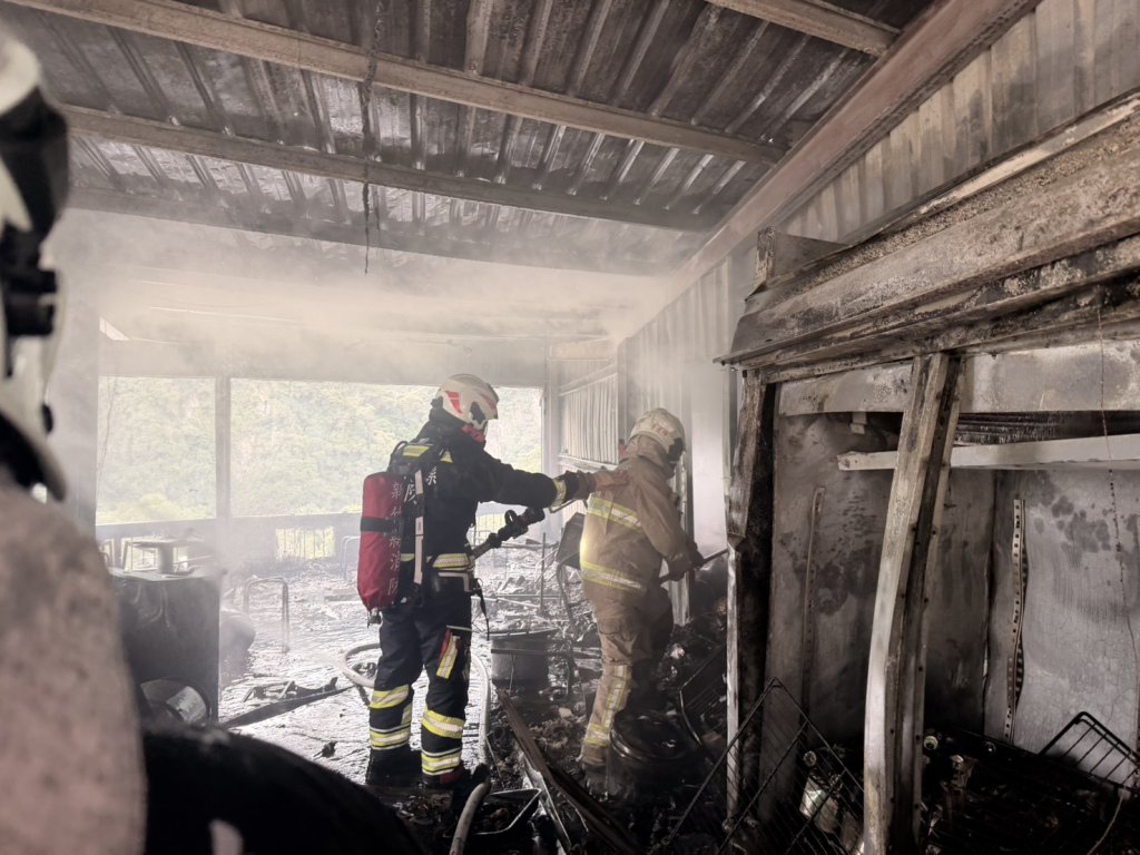 【Lai傳媒、記者爆料網/周庭慶/新竹報導】新竹縣消防局今(10)日上午8時53分接獲報案,五峰鄉大隘村一家鐵皮搭蓋小吃部發生火警,立即派遣第二大隊、五峰、花園、竹東及北埔等分隊車組共9車18人前往搶救。經消防人員全力搶救,9時22分火勢控制,於9時35分回報火勢撲滅,並持續進行殘火處理;9時52分確認火勢完全熄滅。