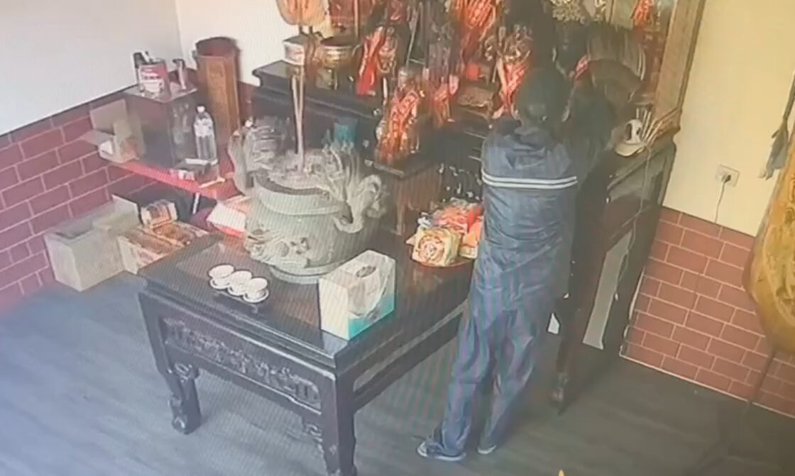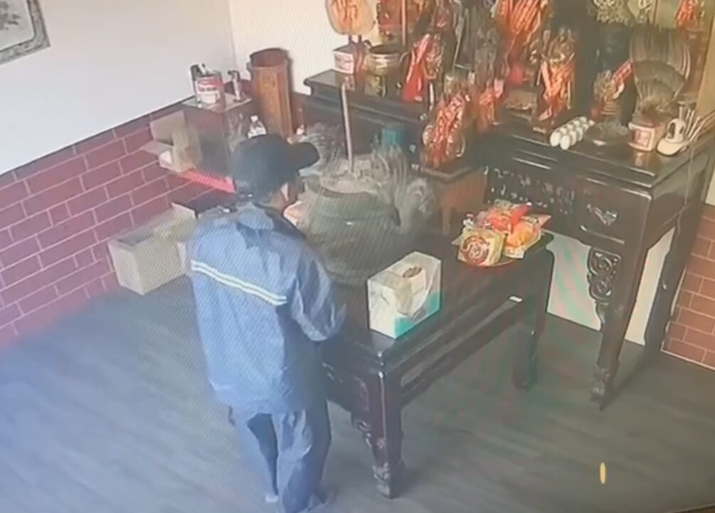 【Lai傳媒、記者爆料網/周庭慶/台中報導】台中市后里區一處宮廟昨(9)日下午遭竊!1名闖入竊取神尊上的金牌,下手前該竊賊先點香膜拜,接著要硬扯神尊上的金牌時將神尊扯落地,結果金牌卡在神尊的帽子上,竊賊趕緊將金牌摘下,然後將帽丟在地上落跑,信徒從視器畫面看到竊賊如此粗魯的犯案手法氣得大罵:「么壽!」
