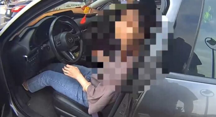 警方將駕車自撞女子扶出車外。翻攝畫面