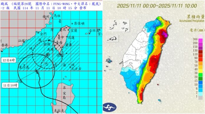 但是今天因為受到颱風外圍環流及東北季風的影響,基隆北海岸、大臺北、東半部地區及恆春半島有陣雨,並有局部大雨或豪雨,尤其東半部山區有局部豪雨等級以上降雨發生的機率,其他地區及澎湖、金門、馬祖有局部短暫陣雨。目前已在宜蘭、花蓮、臺東等地區降下大雨,到上午10時30分為止,累積雨量前14名都落在宜蘭地區,雨量驚人。