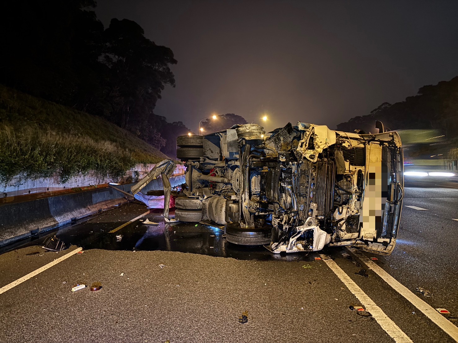 國道警第二大隊表示,12日凌晨3時左右,周姓男子(50歲)駕駛營業半聯結車,行駛國道1號南向150.4公里苗栗三義路段輔助車道,疑因分心駕駛致車輛向右偏移撞擊外側護欄後翻覆。事故造成駕駛手腳擦挫傷,未送醫,駕駛人酒測值為0,後續由隊造橋分隊調查處理。