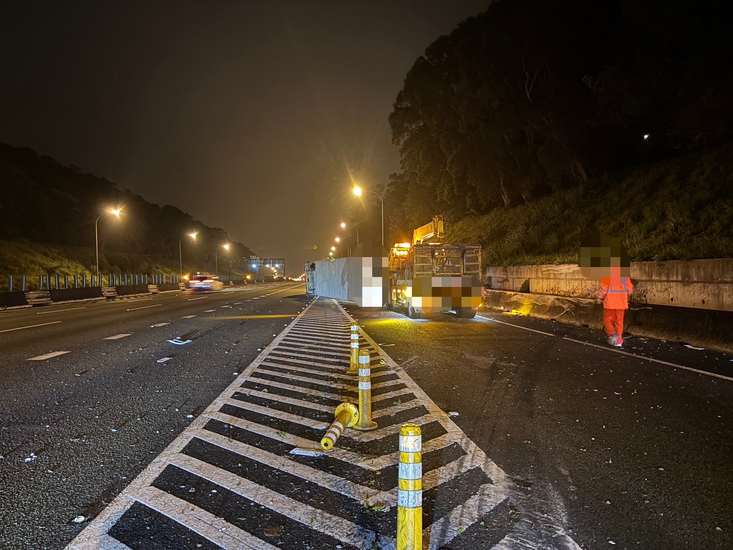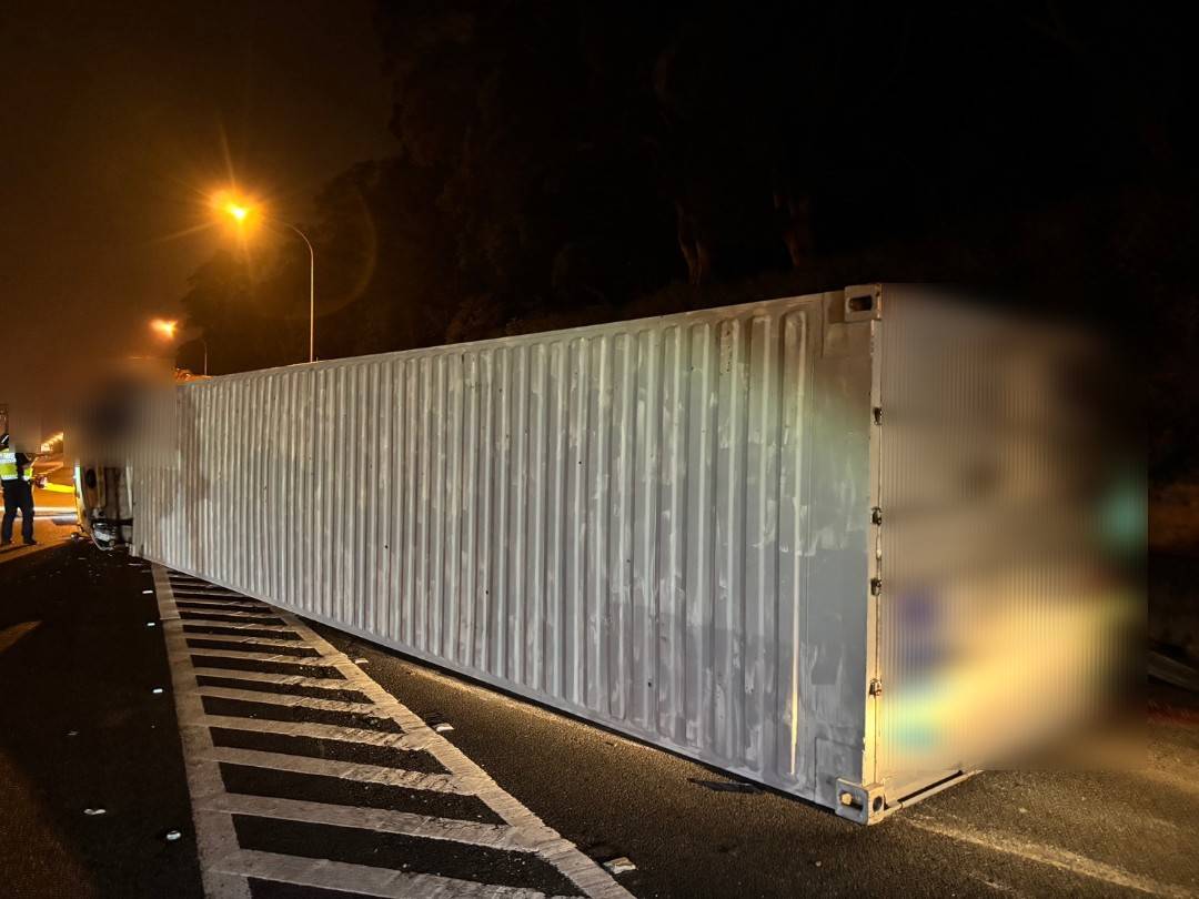 國道1號貨櫃車翻覆貨櫃掉落路面。翻攝畫面