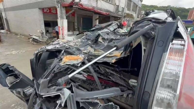 蘇澳民眾車子被救災軍方裝甲車輾過成廢鐵。翻攝畫面