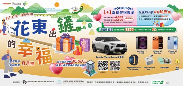 為了讓旅程驚喜再升級,同步推出「花東出『鏟』的幸福!感恩有你!月月送」抽獎活動。活動期間自114年11月1日至115年2月28日止,凡於東區觀光圈 East of Taiwan 合作業者(食、宿、遊、購、行)消費滿500元,即可登錄發票參加抽獎;滿1,000元可享雙倍中獎機會。每月均有住宿券、3C產品及花東大禮包等多項好禮;此外,於光復鄉消費的旅客,更可參加加碼抽獎,有機會獲得iPhone 17與台糖住宿券各1名。活動最終再加碼的「鏟出幸福獎」將送出Toyota Yaris Cross汽車、金豆及多項驚喜大獎,讓旅途幸福滿載,驚喜不斷。