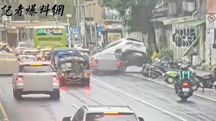 由於肇事車輛持續推撞,造成首當其衝的休旅車被撞到270度側翻,甚至還波及了人行道旁停放的2輛機車。