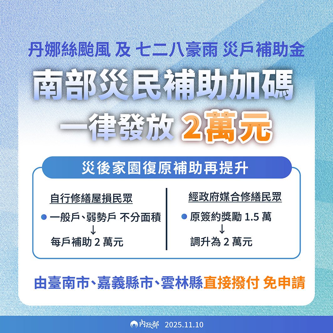 根據公告,凡是未參加政府媒合修繕平台、自行修繕屋損的災區民眾,包括一般戶及弱勢戶,不分面積一律發放2萬元補助金。另外,於今(114)年9月3日至10月6日期間,由政府媒合簽約修繕的民眾,原1.5萬元的簽約獎勵金也一併同步調整至2萬元。