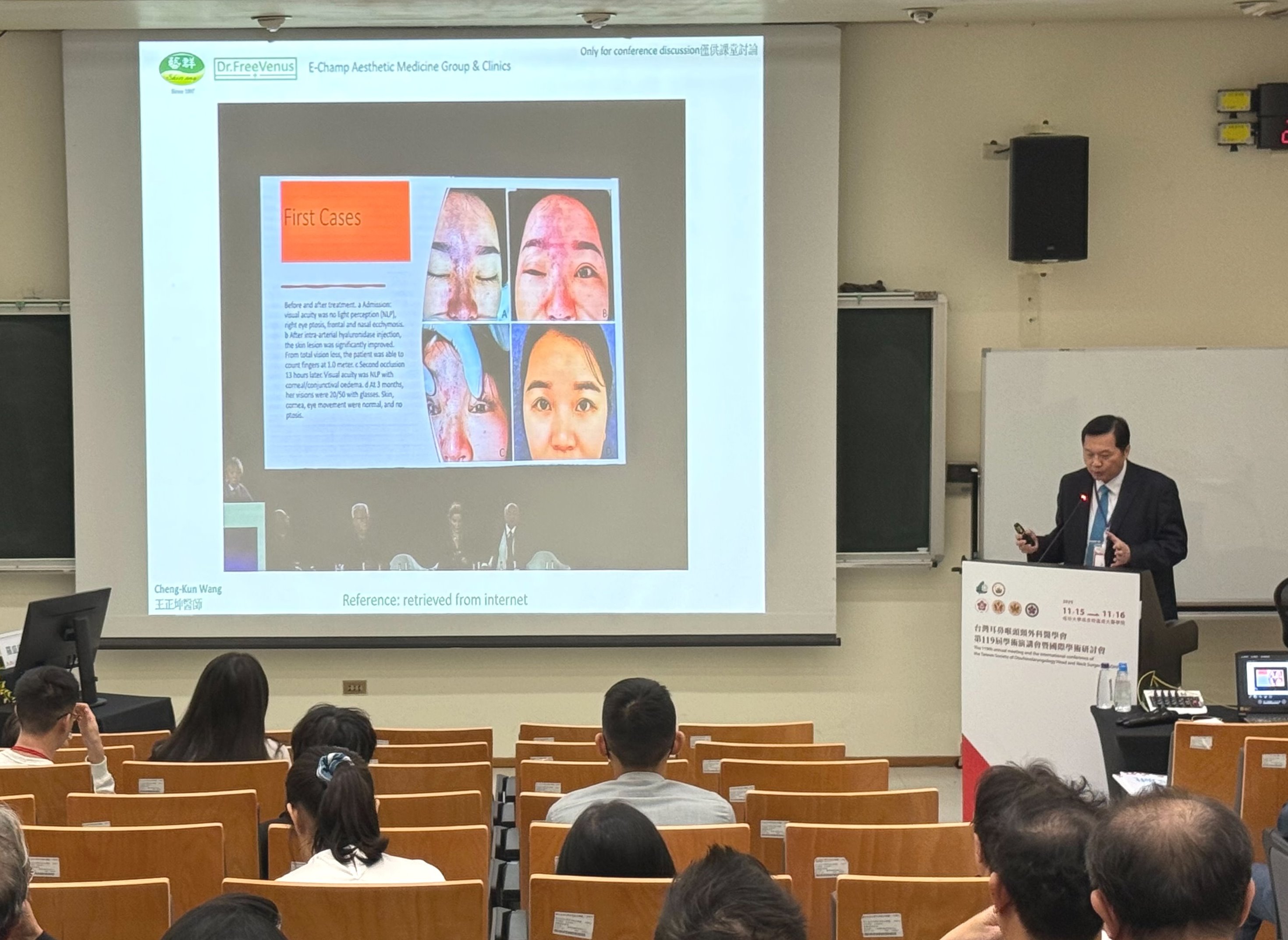 王正坤醫師於講座中以實際案例分析臨床常見的併發症,並提出具體預防與治療建議,常見三類醫美併發症有雷射或電波拉皮的術後反黑、肉毒桿菌素注射導致眼皮下垂與臉部不對稱、玻尿酸注射導致血管栓塞、壓迫或眼睛失明。
