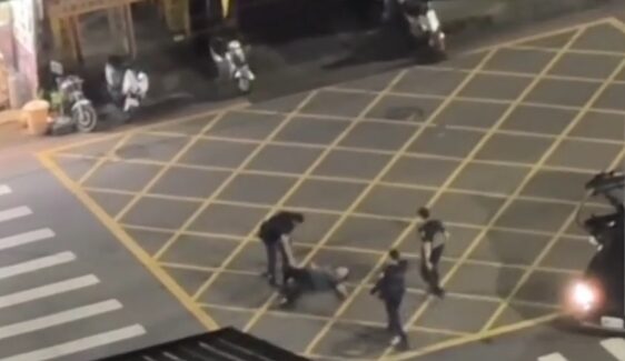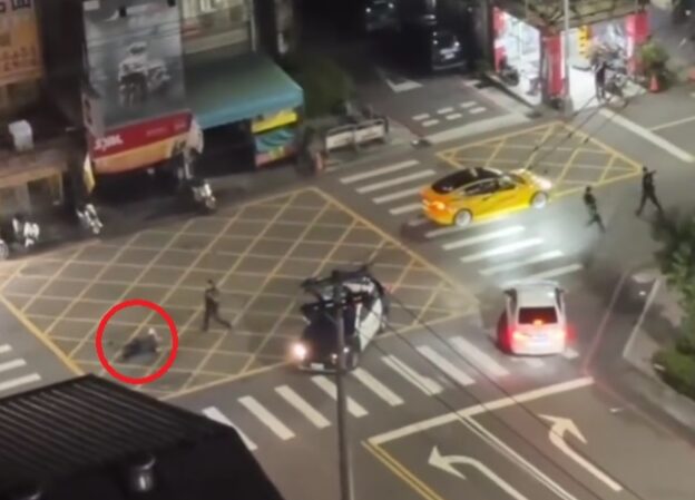 台中一名男子阻止飆仔橫行遭攻擊倒地(紅圈處),員警獲報到場處理及圍捕。翻攝畫面