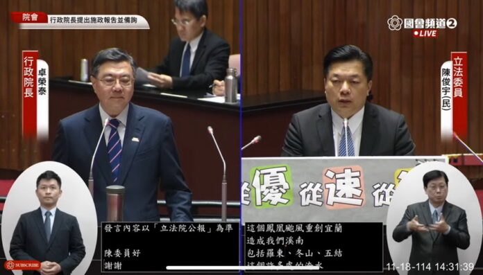 鳳凰颱風重創宜蘭溪南地區,蘇澳鎮發生多處淹水、土石流災情,市區一度淹到一層樓高,造成人命傷亡與財物損失嚴重。立法委員陳俊宇11月18日在立法院質詢行政院長卓榮泰時,要求中央提高補助標準、擴大慰助範圍,並儘速提出災後重建協助措施。