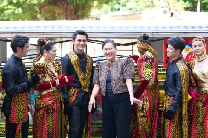 菲律賓街頭巷尾常見的小巴士吉普尼 -代表與菲國移工組成的舞者合影。(圖/台中市政府提供)